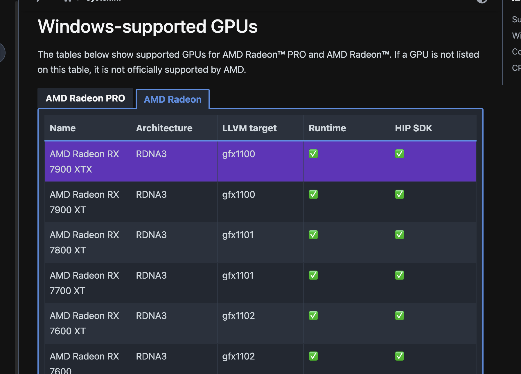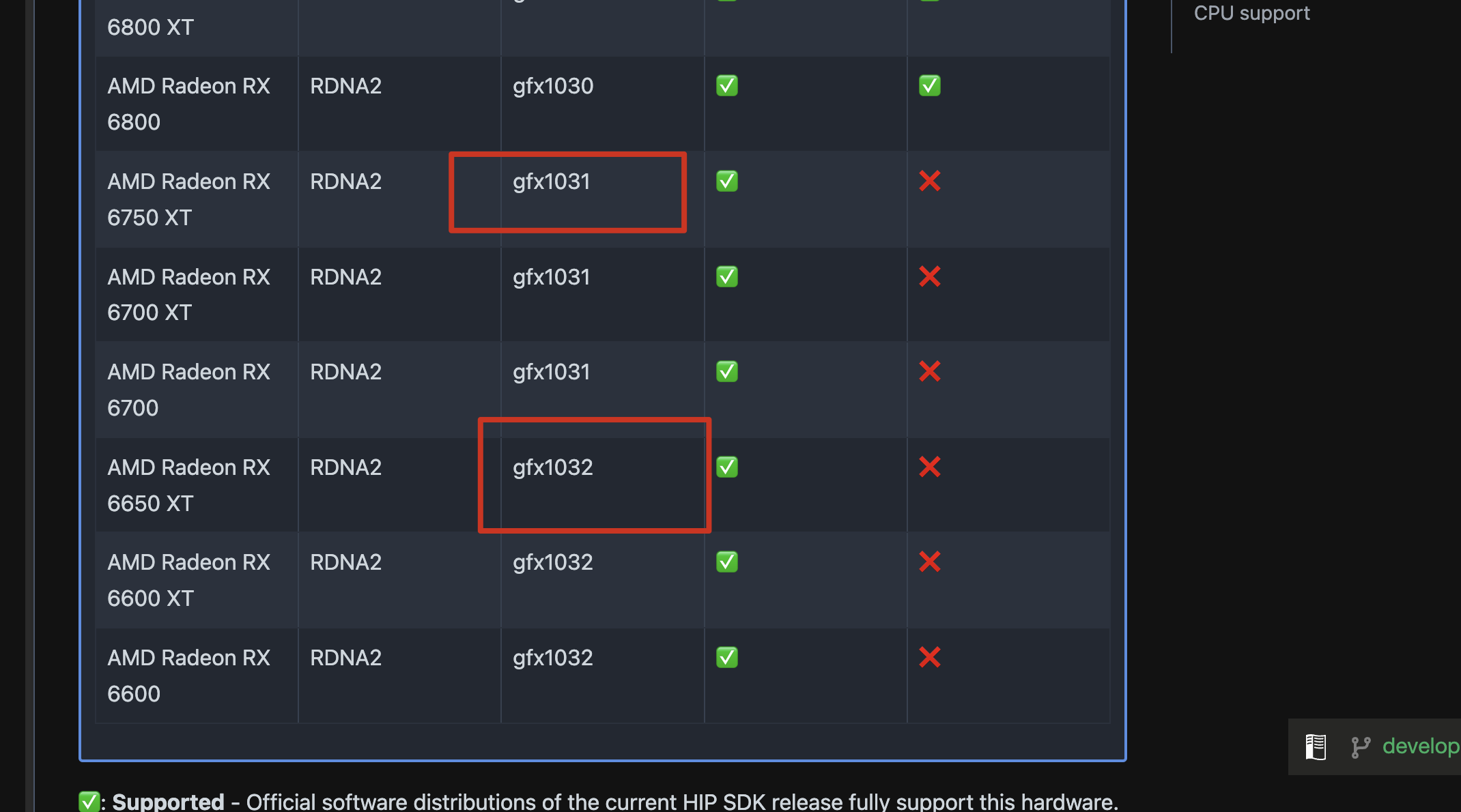 首先去amd网站ROCm是否支持 查看自己的显卡,两个对钩都打上才是默认可以调用